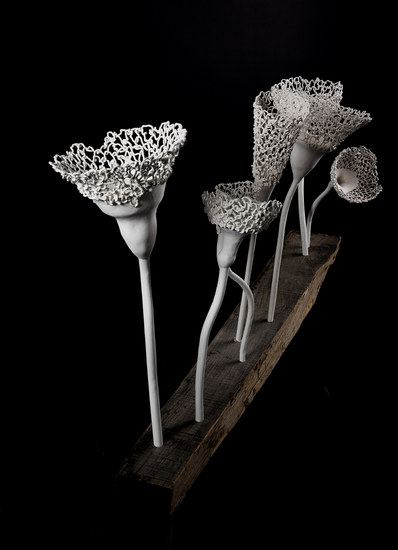 The ceramic flowers are embedded into the wooden stand which is also a part of the installation. The flowers are asimetrically but thoughfully placed into the composition, every flower stalk ends with a blossom which is carefully and subtly designed.