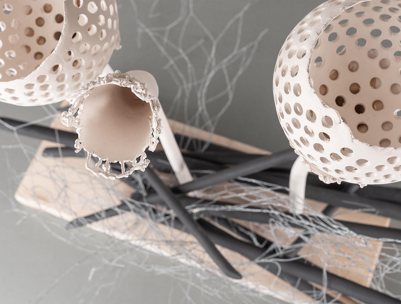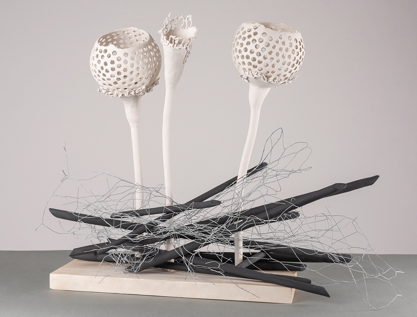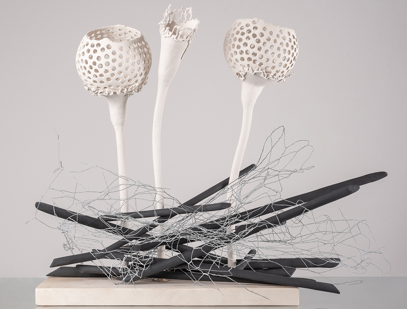 White flowers represents the light and hope, the positive power of a child mind. The dark elements of the garden are placed into a wire web representing a conventional society which is affected from rules and rational thinking of adults. It is a process that affects one another and continues from generation to generation through centuries. It is beautiful and miraculous.
